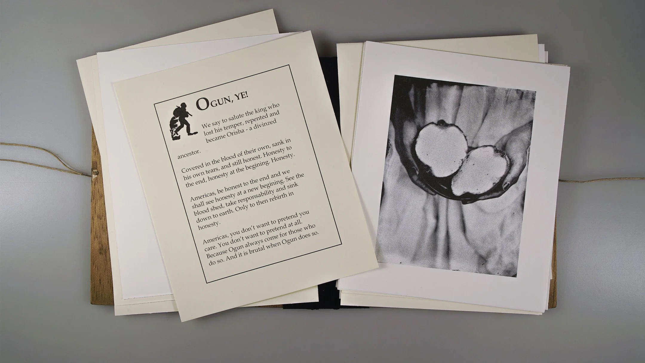 Initiation is an artist book of 26 Risograph-printed pages that brings text and image into a tactile sequence. Written across English, Yoruba, Portuguese, and Spanish, it draws together Orisha iconographies and mythologies with layered histories of the Americas. Risograph reproductions of original tintypes suggest offerings made to the Orishas by unidentifiable, and at times absent, subjects. Housed in a varnished wood and black velvet folder, the work invites a slow, ritual-like engagement.