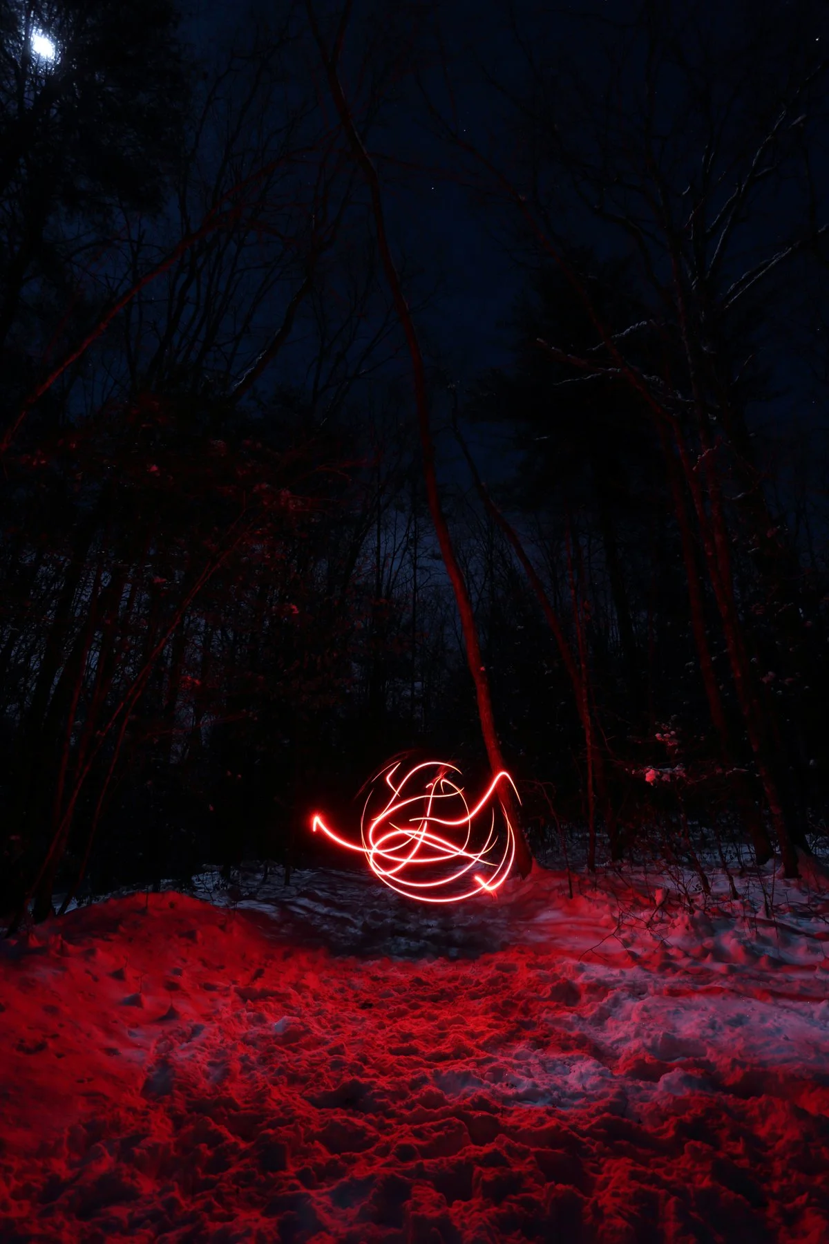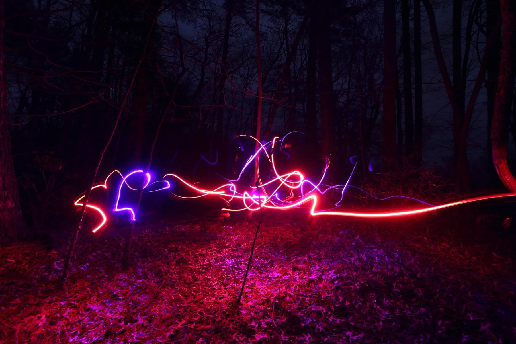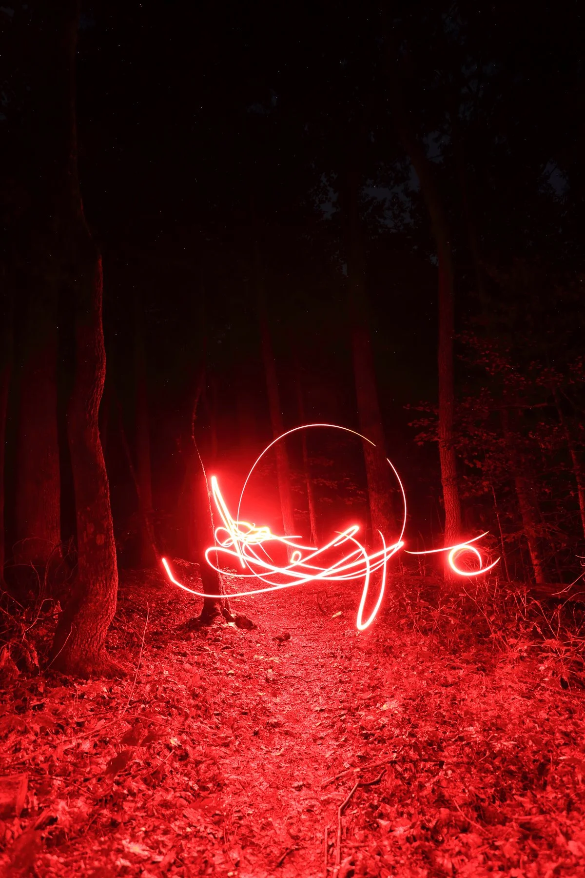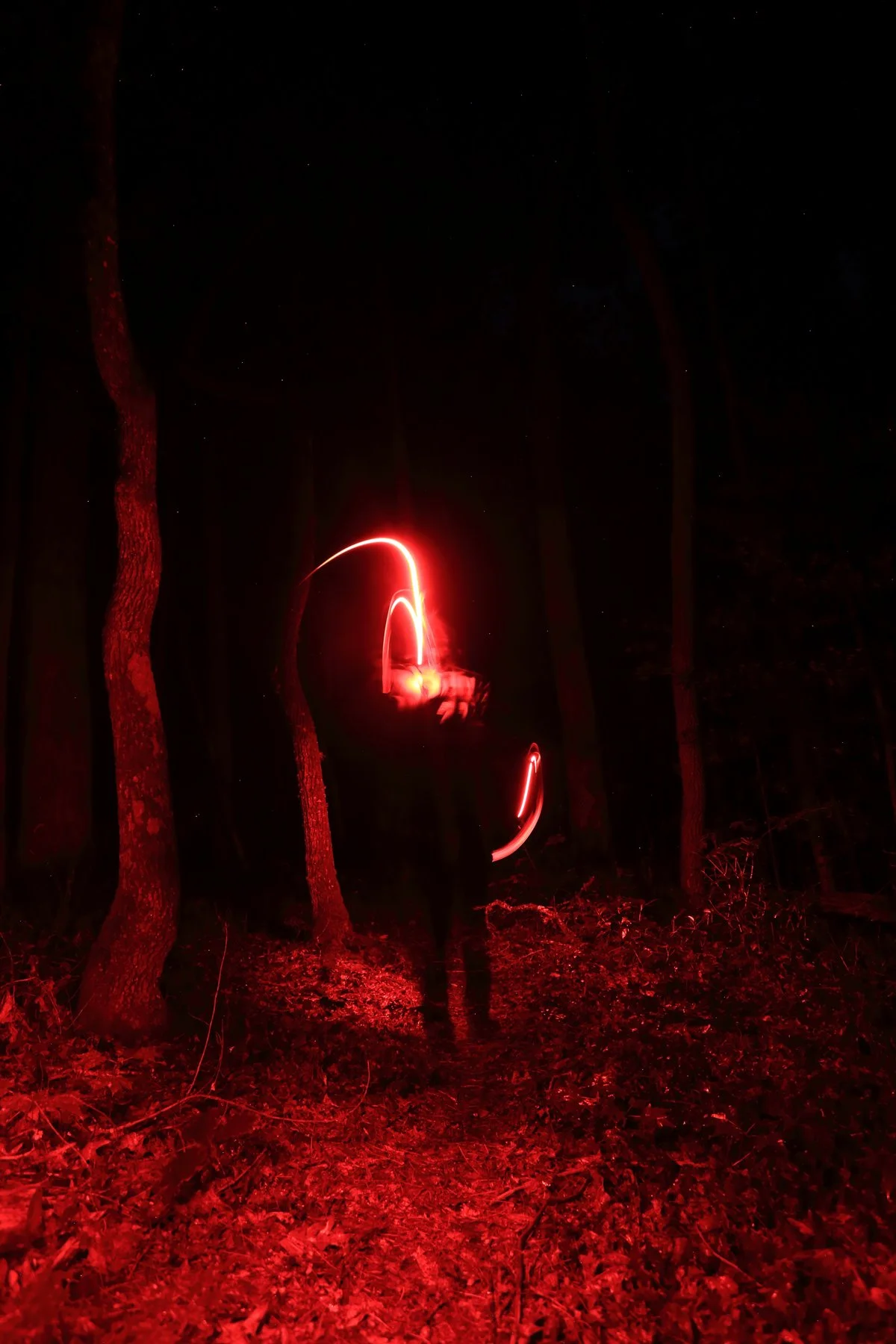 Photographed at night in the forests of western North Carolina, these images are created through long exposure and light painting using a red headlamp. I moved, sometimes danced across the landscape, allowing gestures of fire to unfold within darkness. The resulting streaks are not representations of flame, but traces of energy: moments of presence revealed through time and movement.