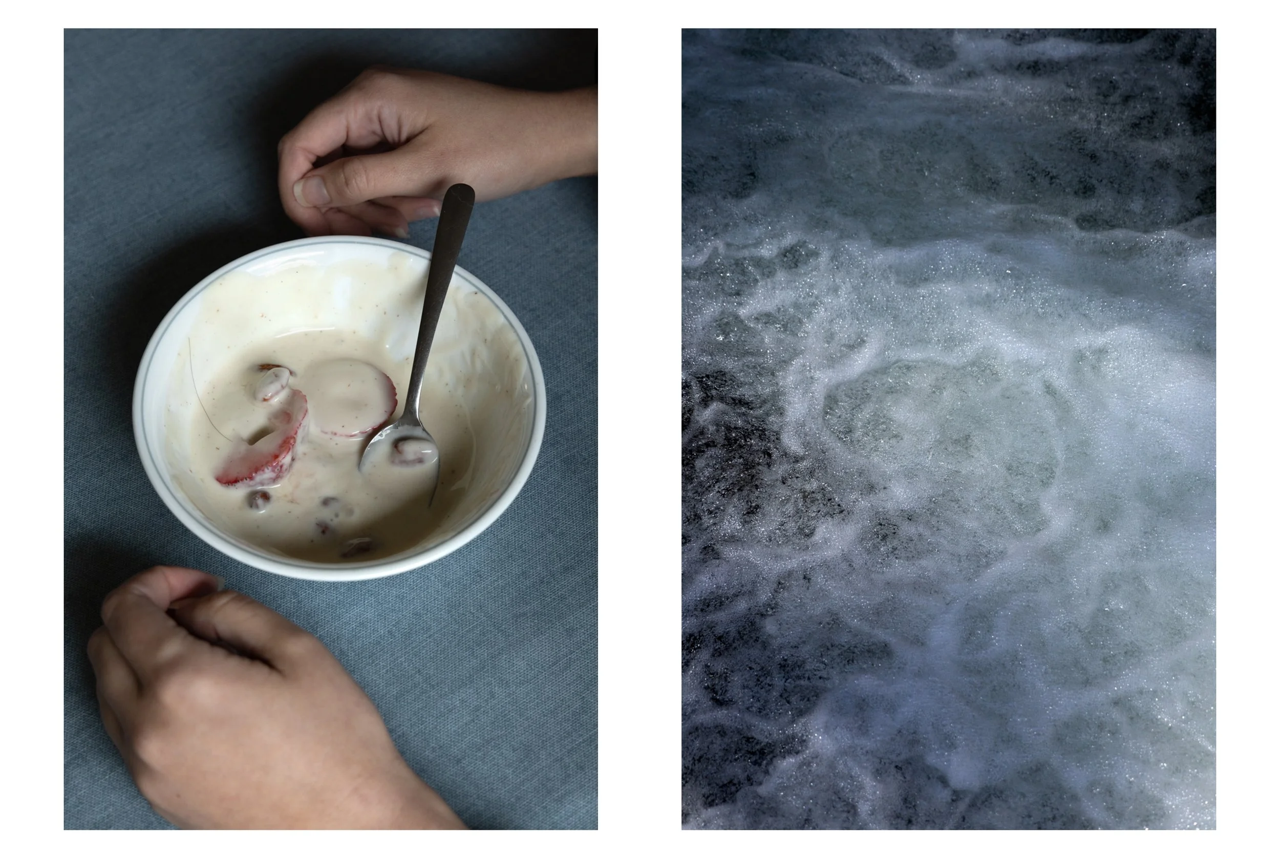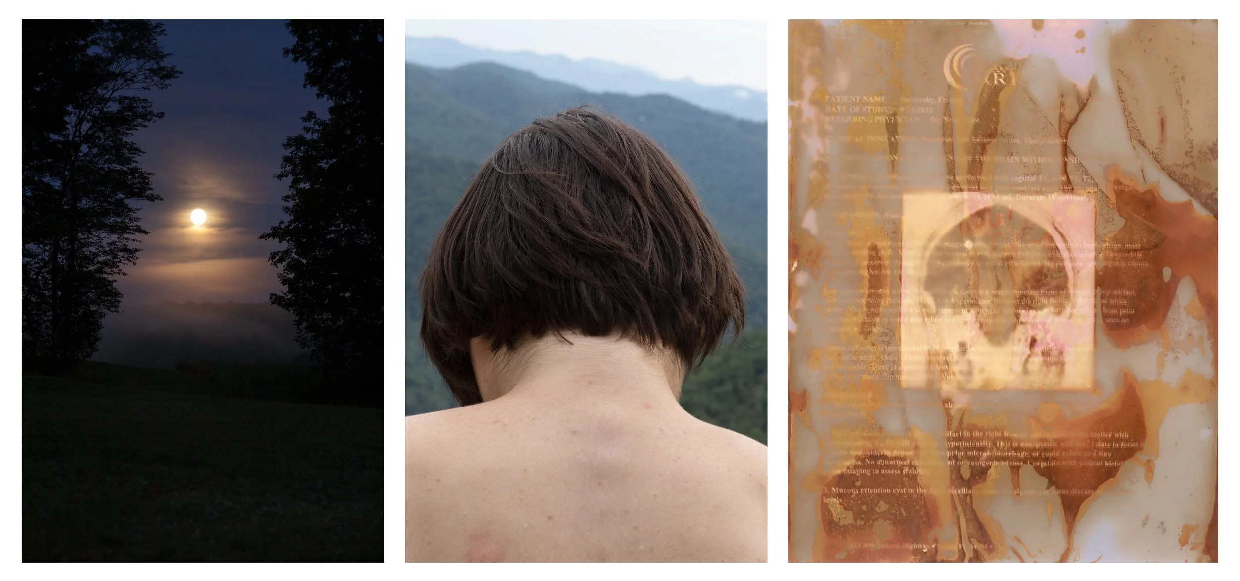 Rather than depicting a journey towards a healed state after trauma and acute illness, Upheaval meditates on the ways that grief lives within my body by returning to repeated visual motifs and gestures in documentary and self portrait photography. Lumen prints of medical ephemera introduce chronic illness into the work as a backdrop that informs images that may not otherwise be read in a medical context. Upheaval points to a continuous process of transition in the relationship between my body and the world I live in.